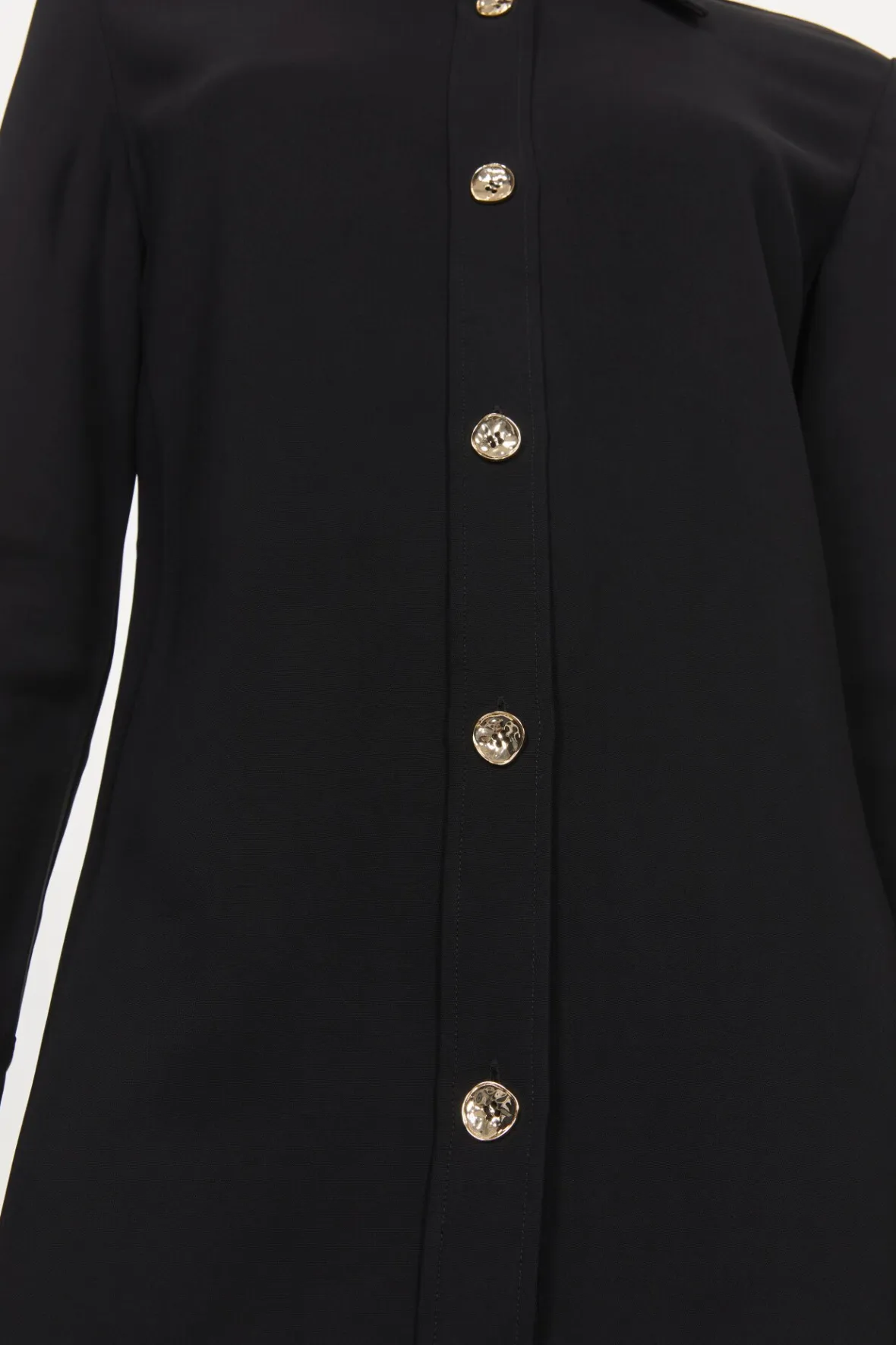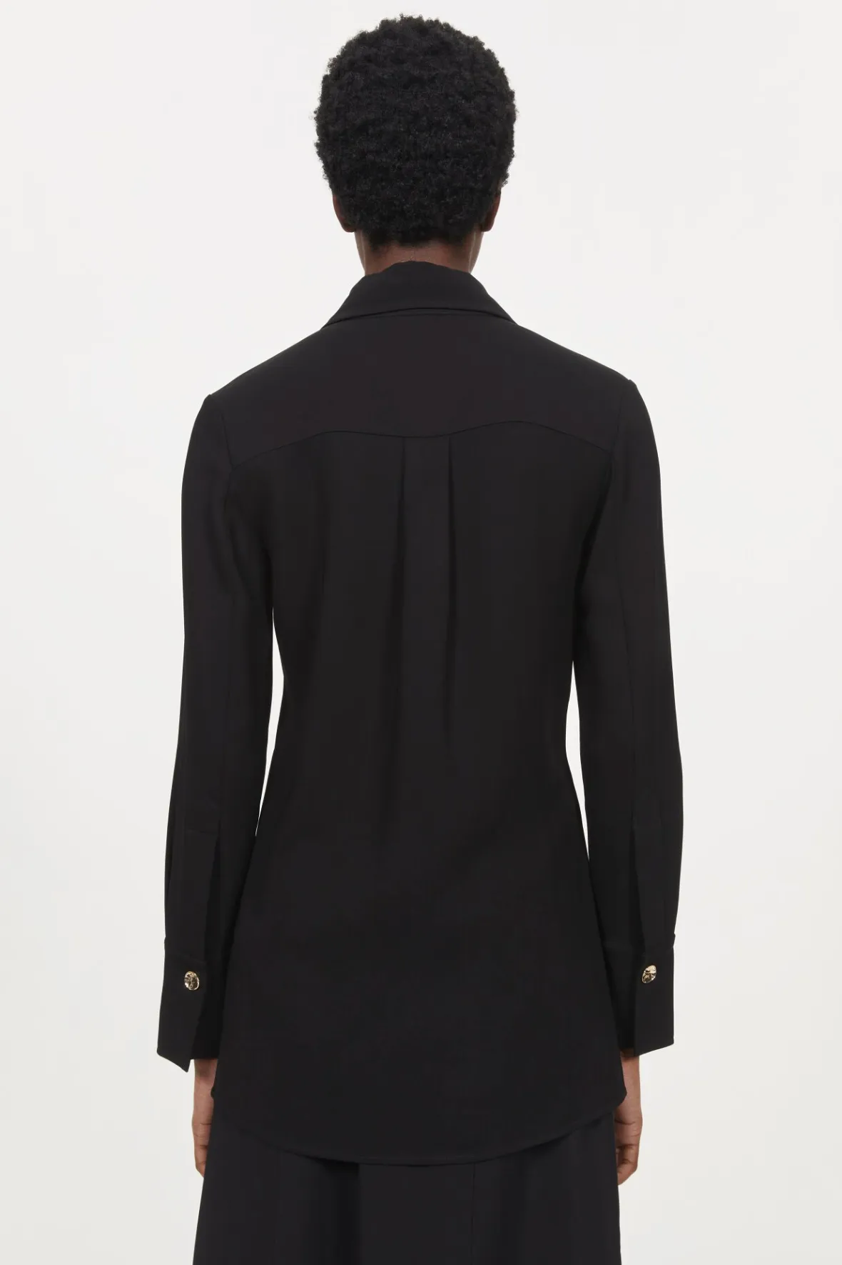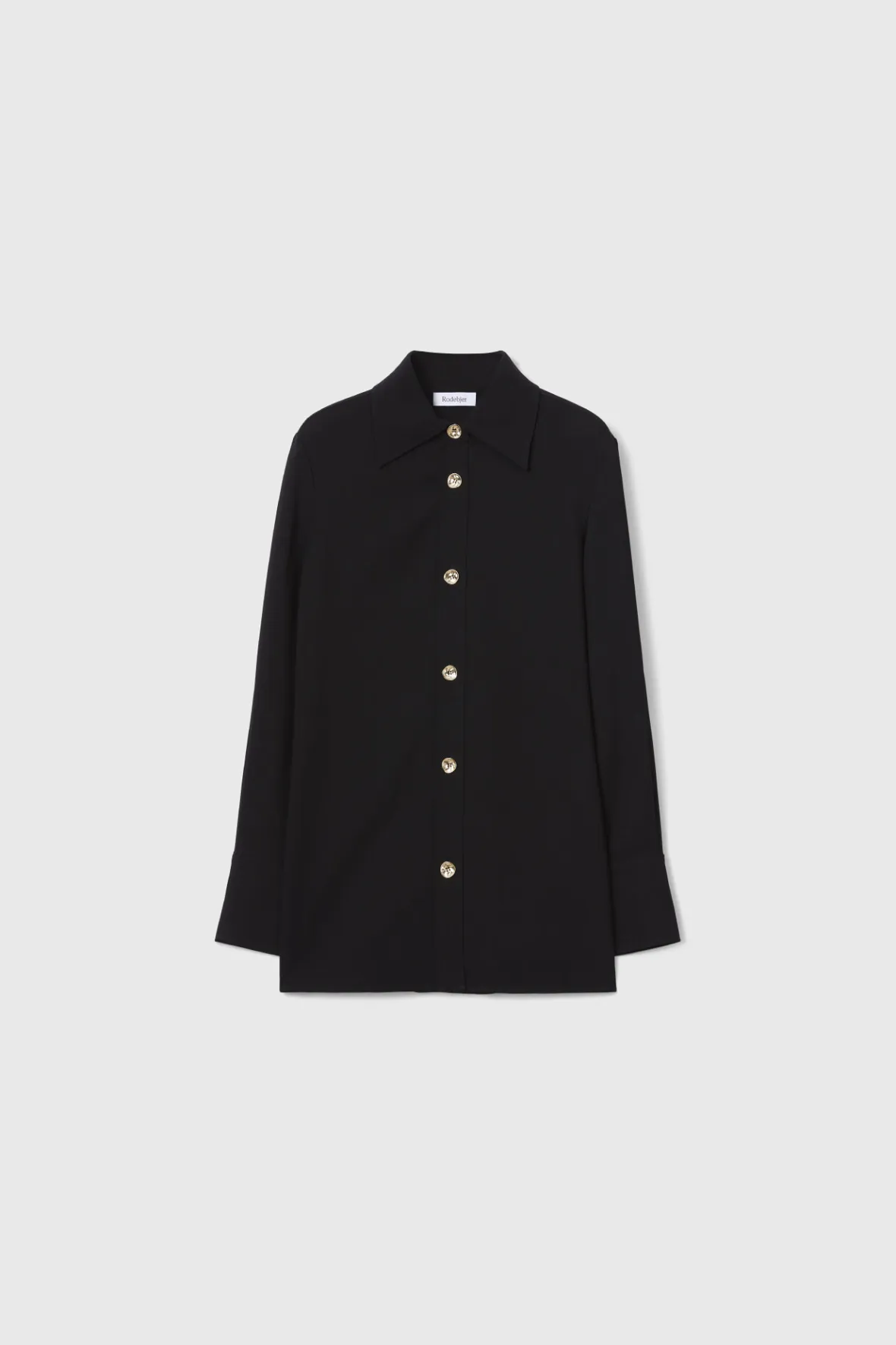 Made from double-layered crêpe with a smooth drape, the Boni shirt’s silhouette is slightly elongated for a relaxed fit. Its details include a sharp collar, and sculptural golden buttons that nod to the season’s key shapes.