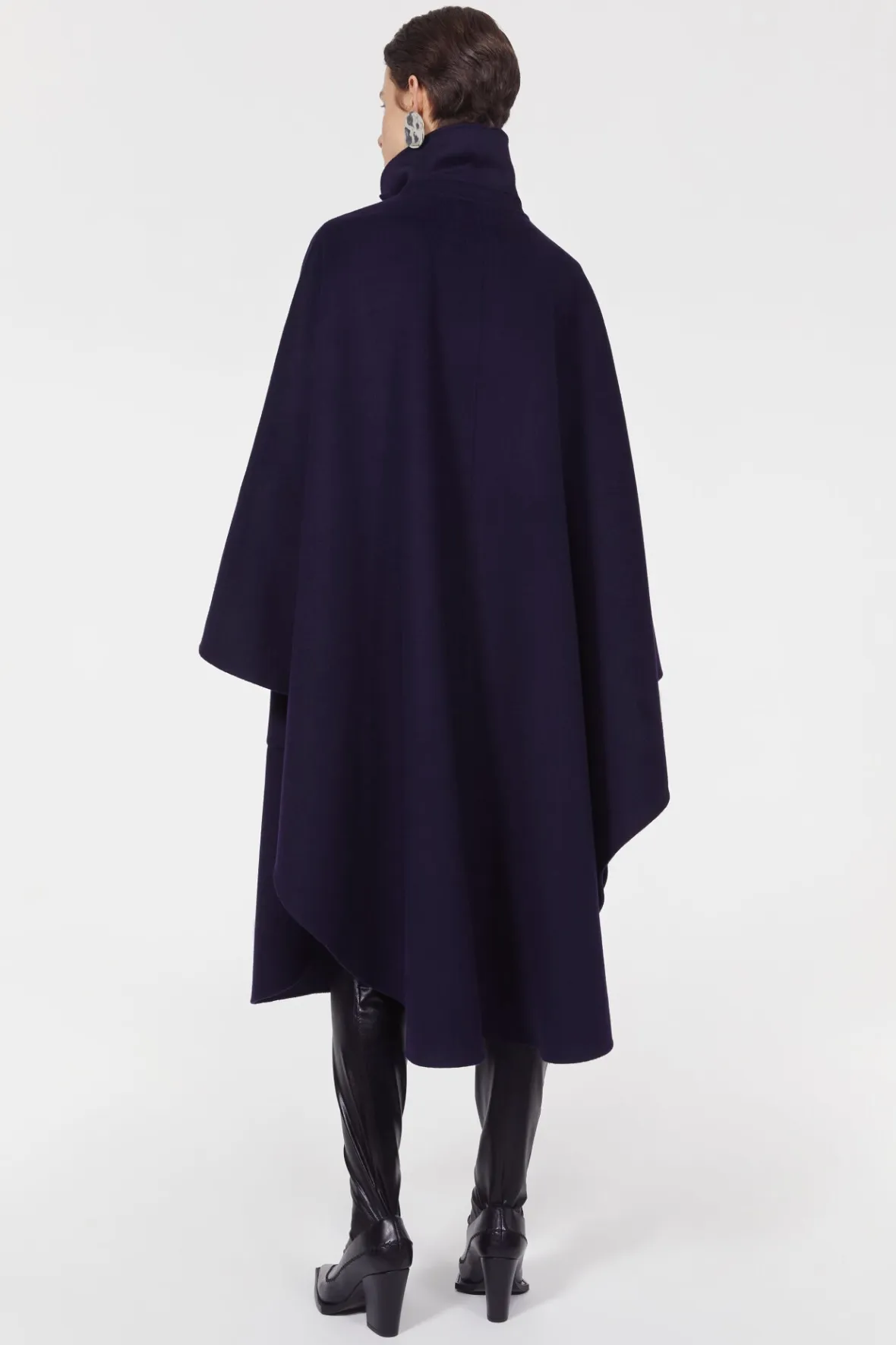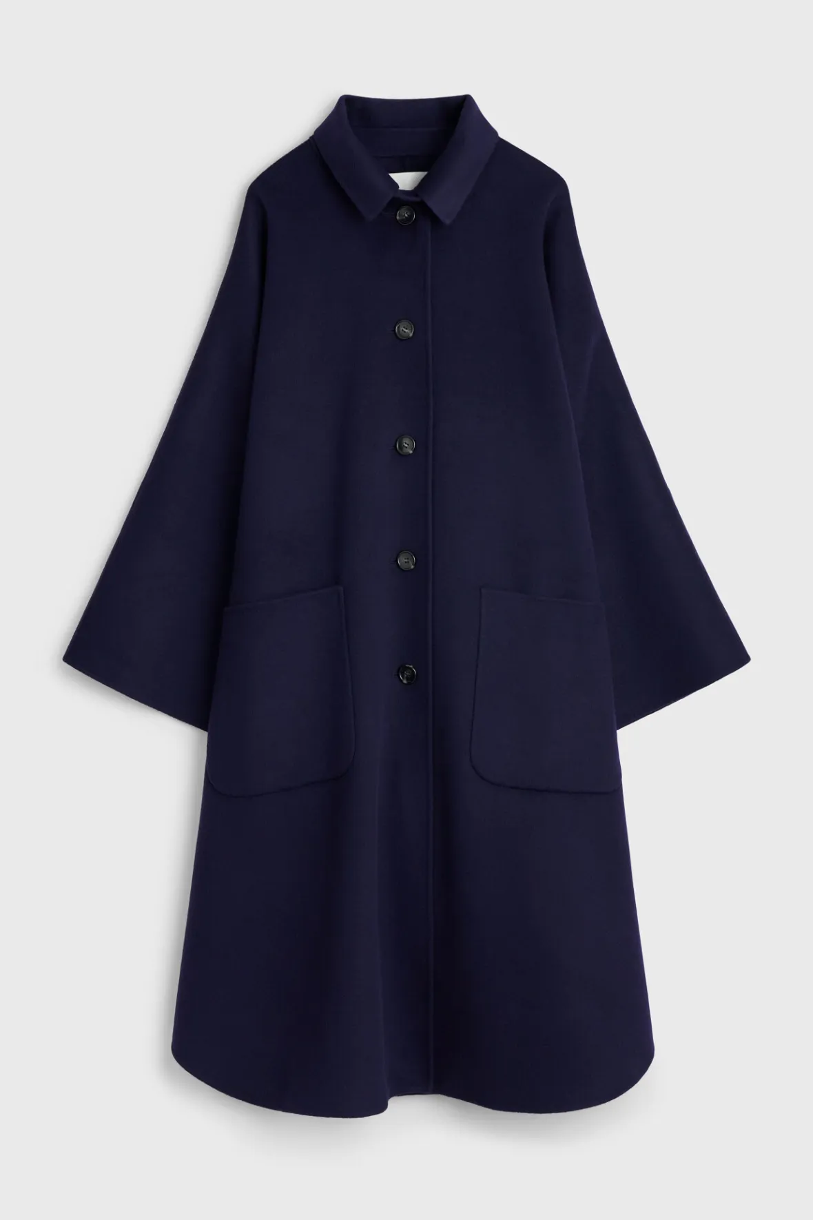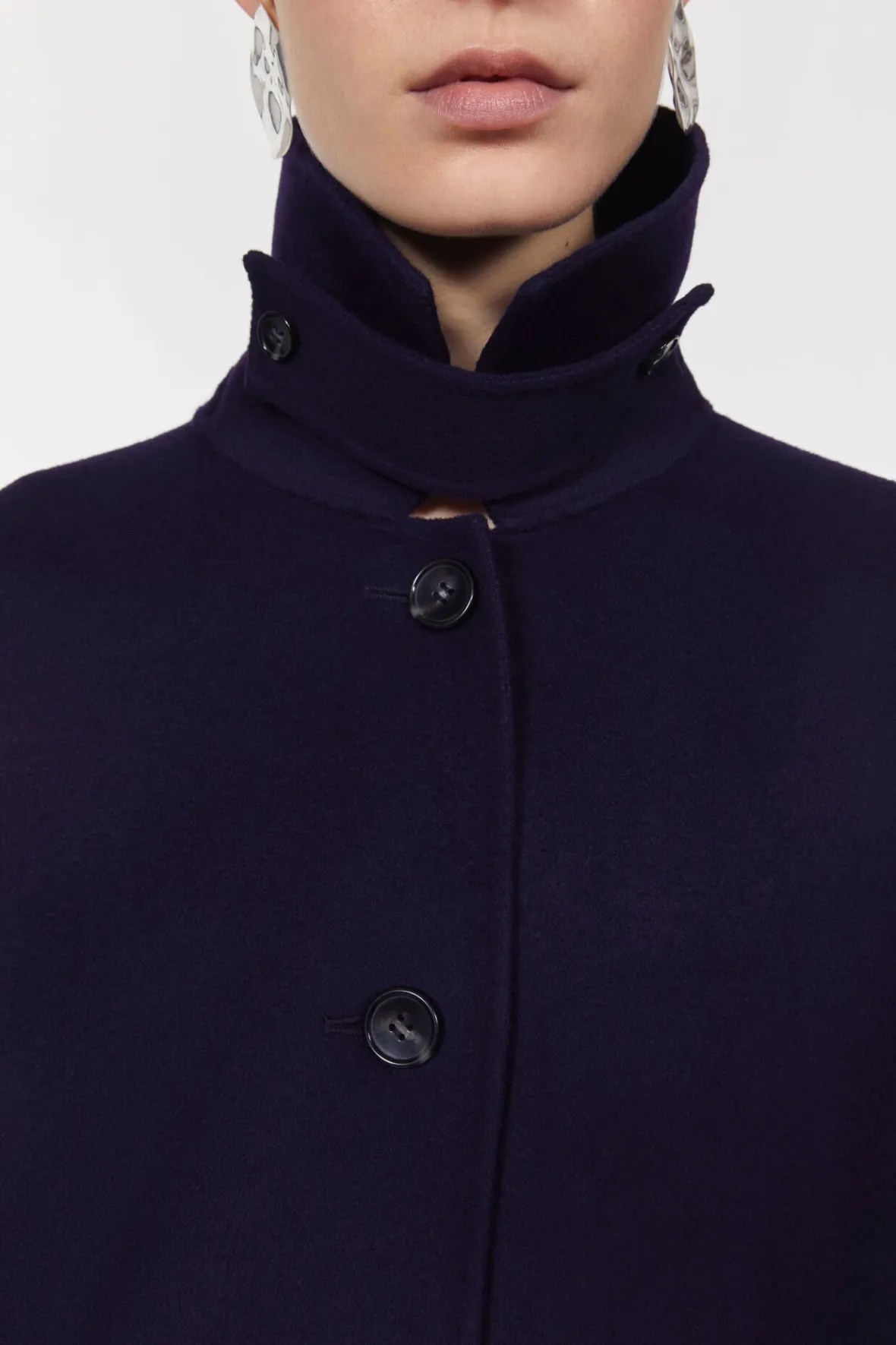 Elegant but with a decisive air of ease, the Pomono coat flows down the figure to a cape silhouette. It is crafted from double-faced wool with a beautiful drape, and has a button-down closure to the front and detachable closure at the collar.