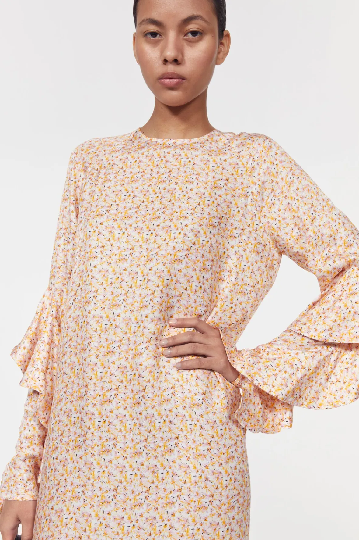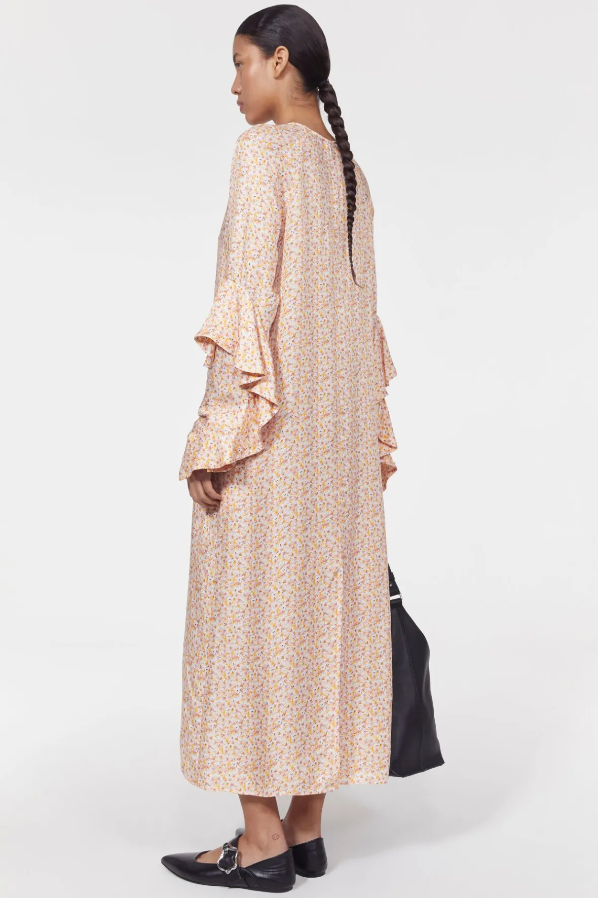 Made from an FSC-certified viscose blend, the Louisiana dress is ideal for transitional styling. Decorated with a petite floral print, it is shaped with flounce detailing at the sleeves and falls to a cropped hemline with a vent at the back. Pair with the Dolores boots to complete the look on a pared-back note.