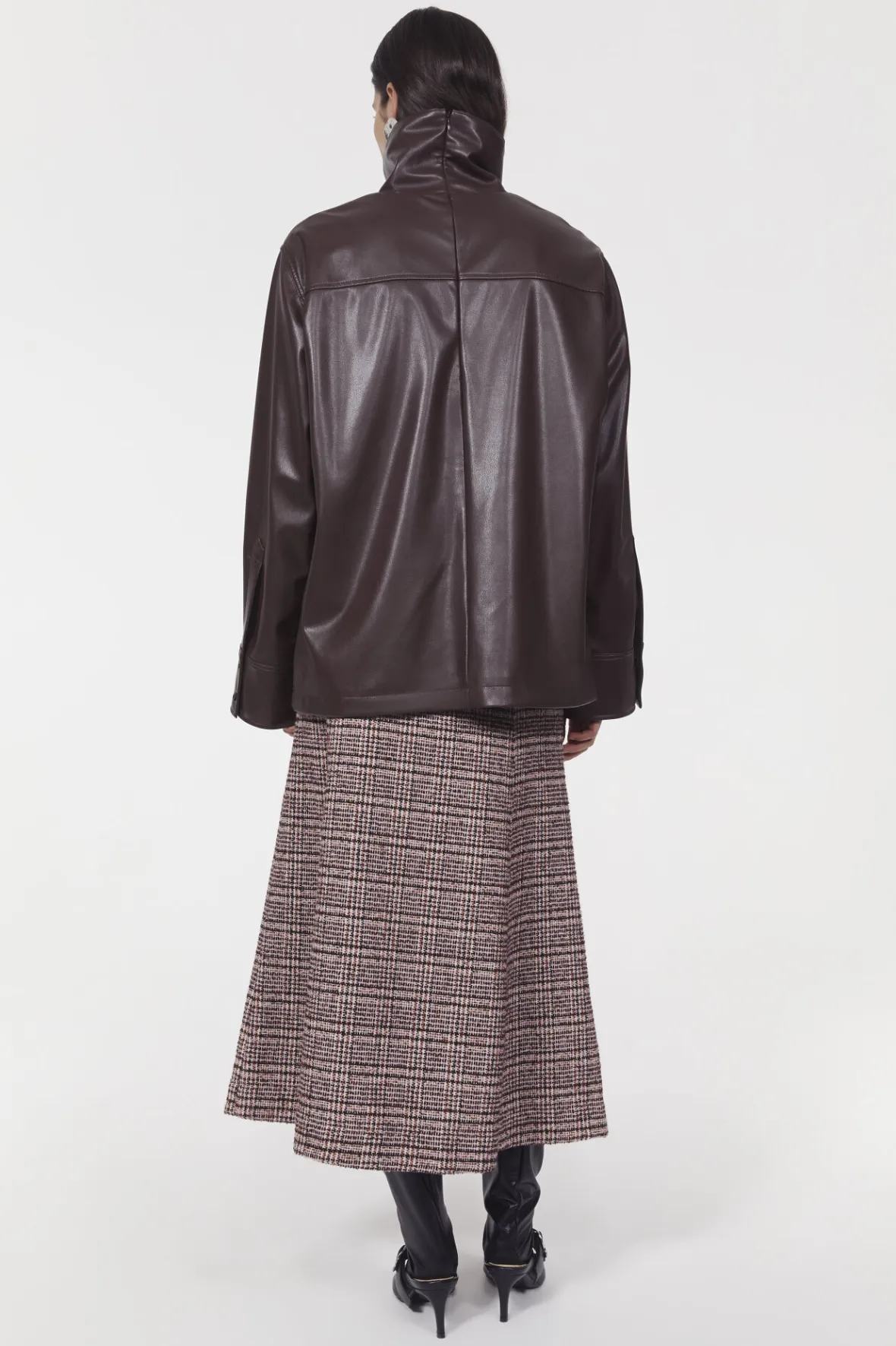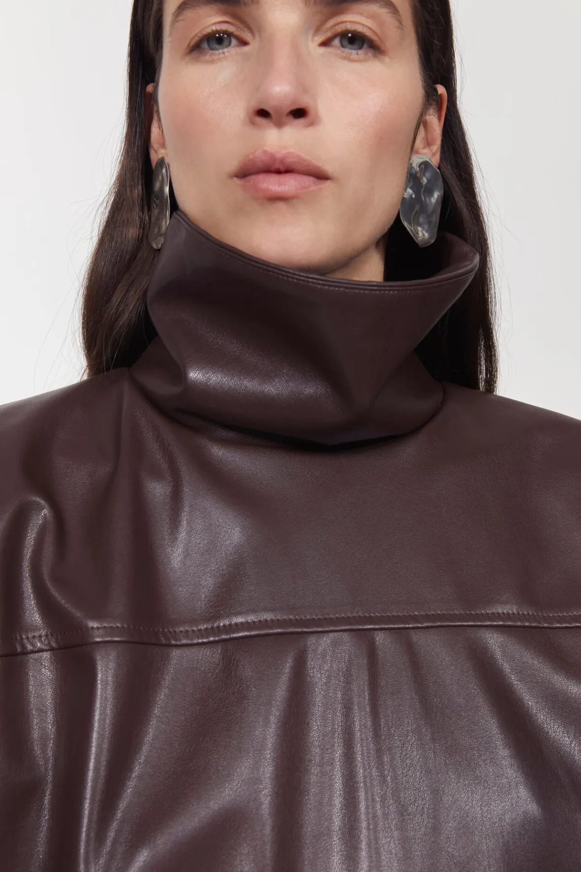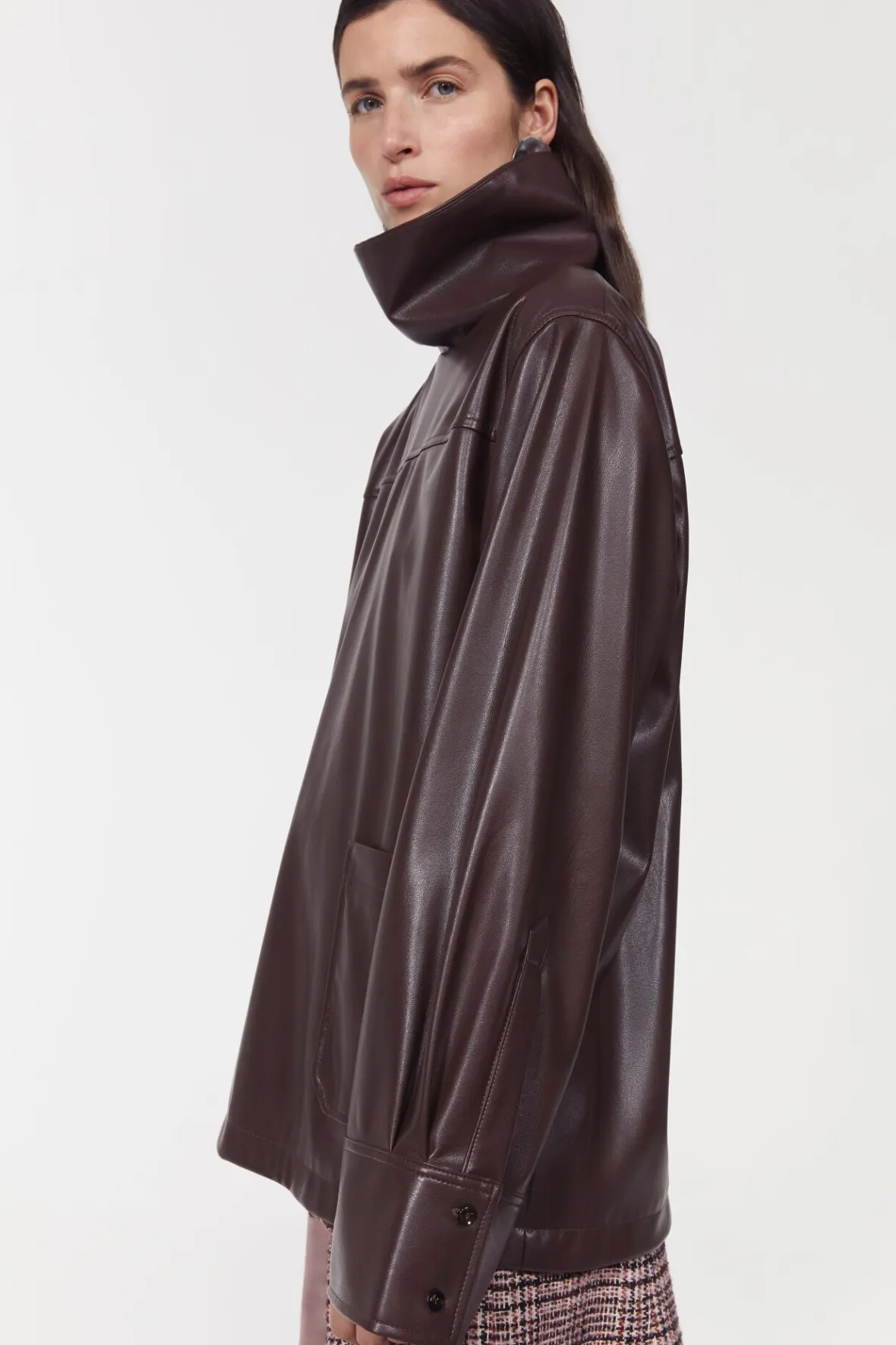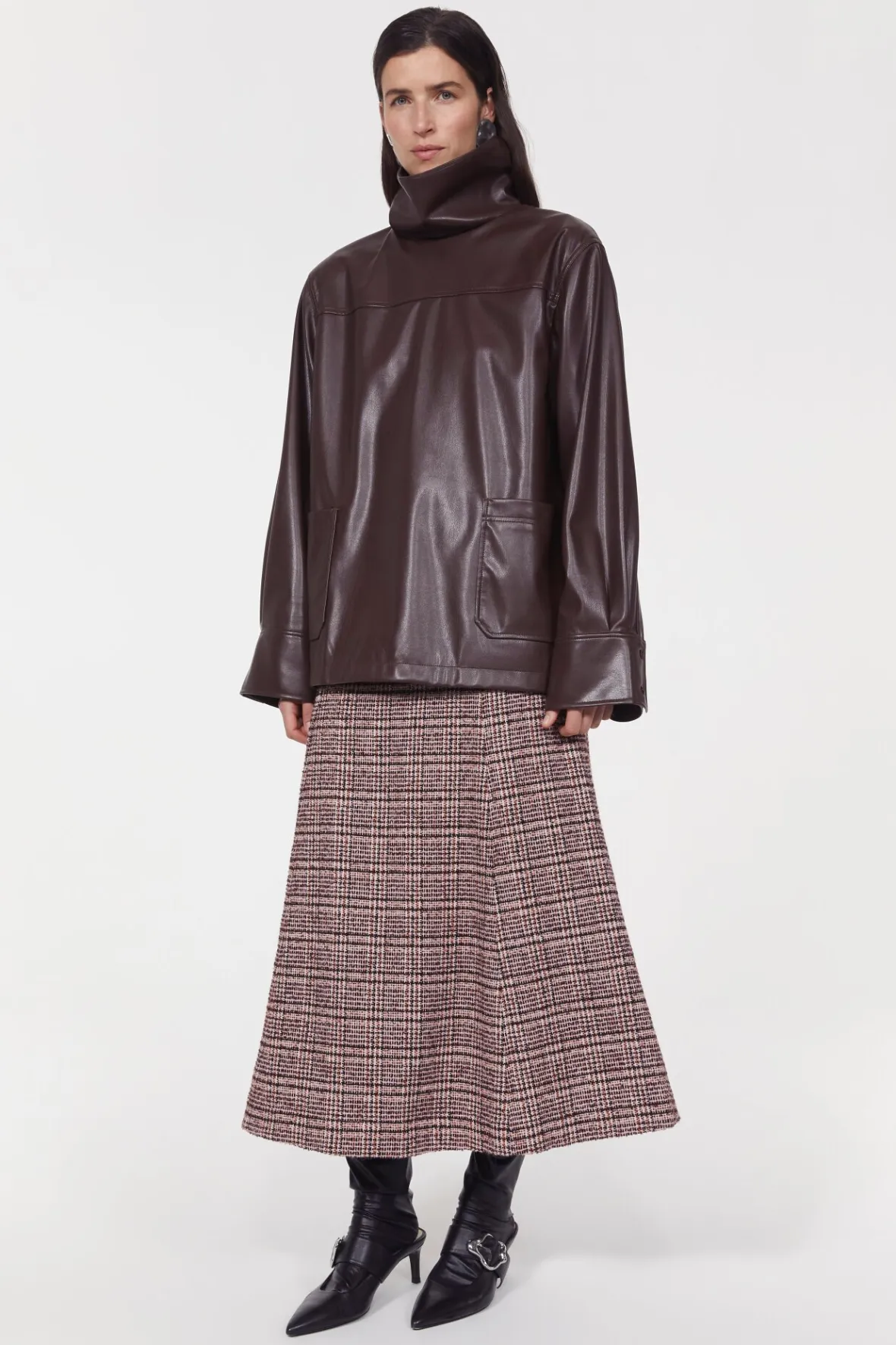 Complement printed pants and knit skirts with the faux leather Cara top. Soft and supple to touch, it has a funnel neckline, dropped shoulders and front patch pockets. Pair with the matching Marlene skirt for a co-ordinated, and decidedly contemporary look.