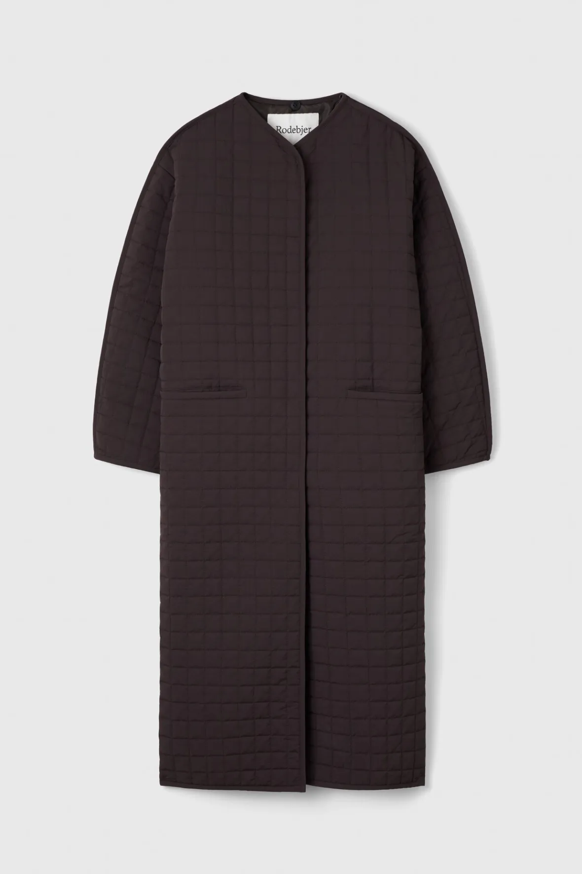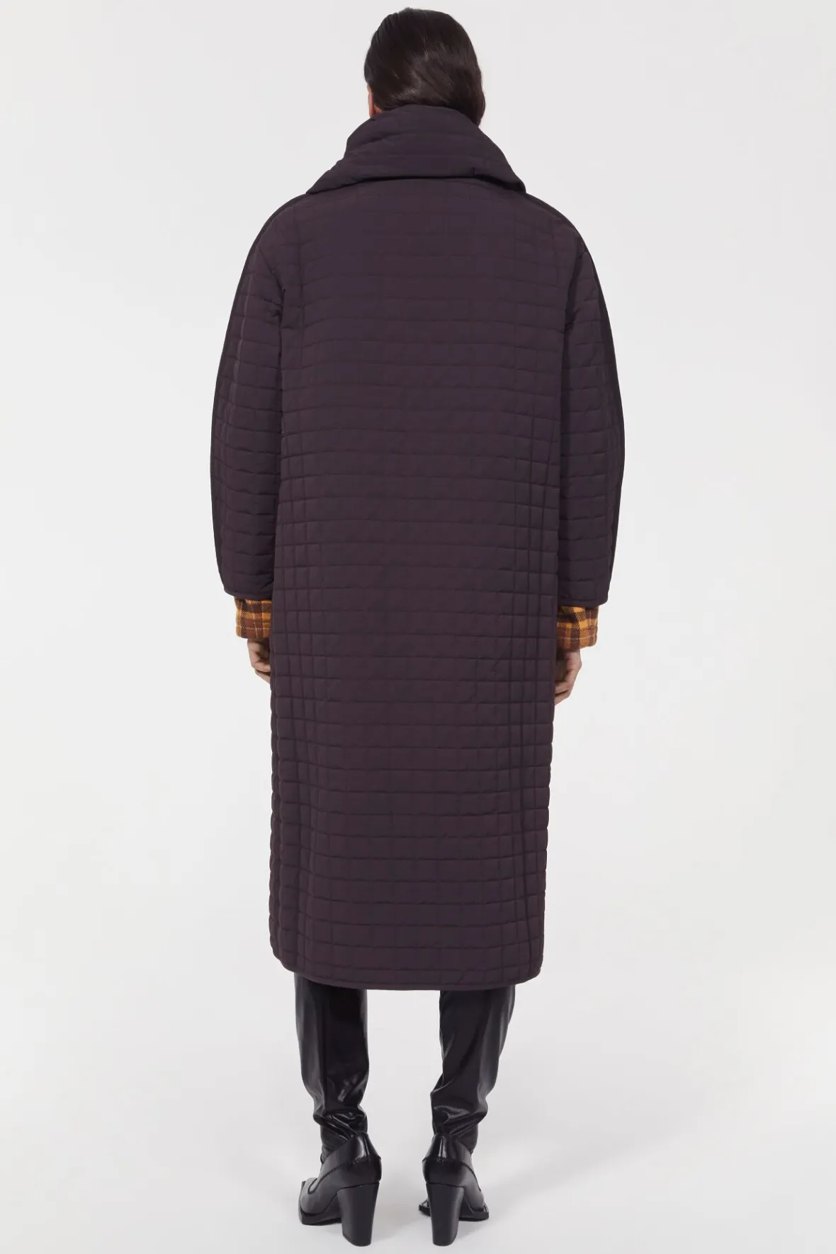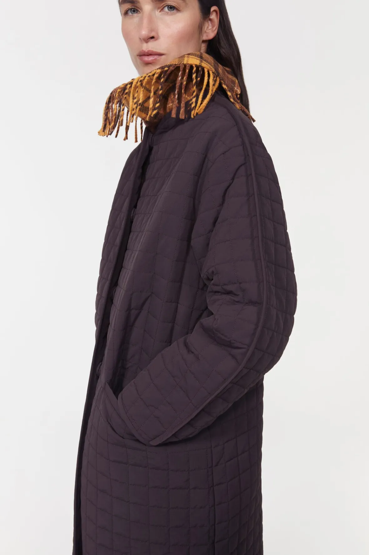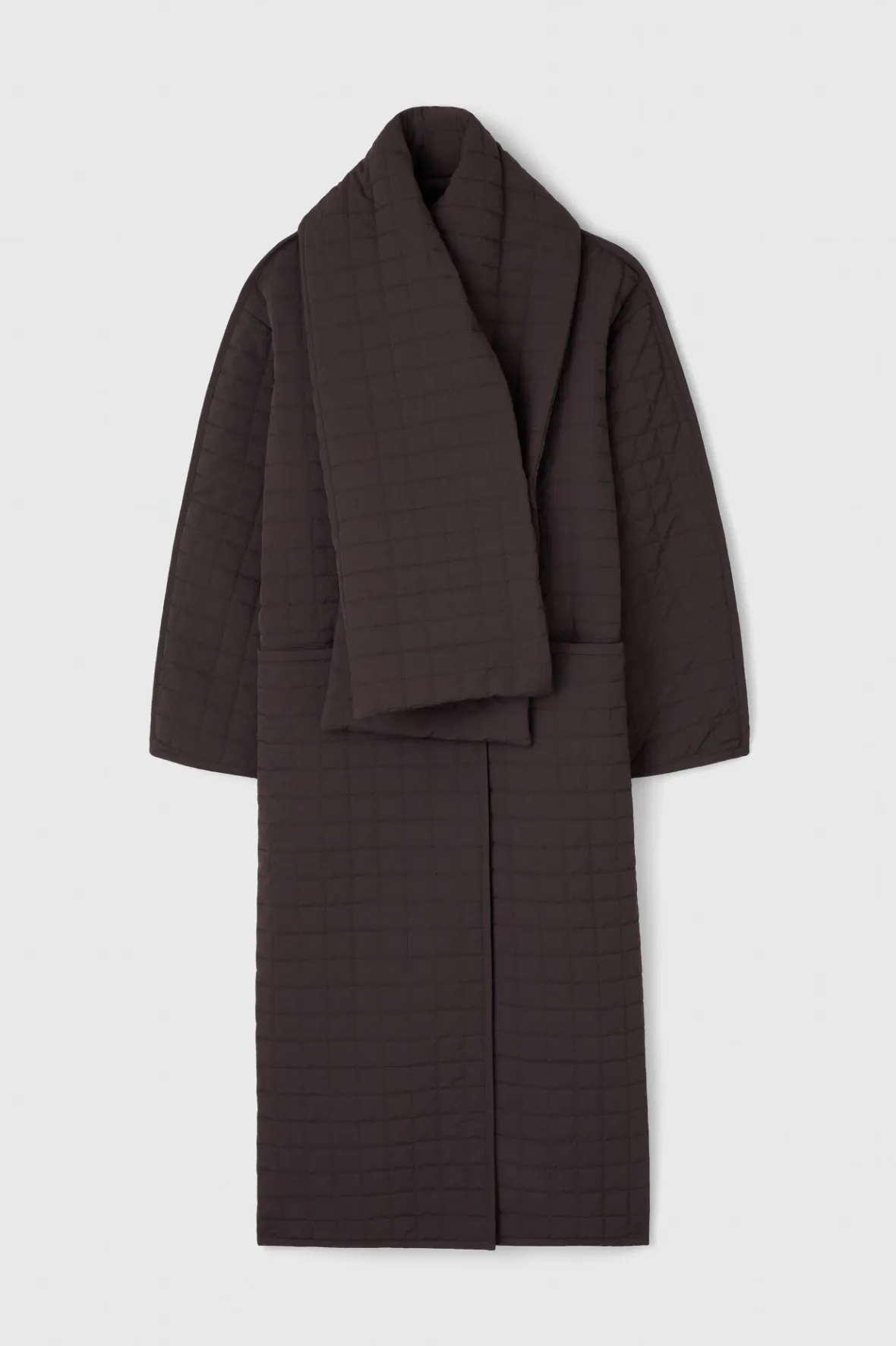 Designed with sustainability in mind, the Gent jacket is crafted from recycled nylon. The lightly quilted piece has sculptural, rounded sleeves and a detachable scarf. Its rich brown hue adds depth to Fall/ Winter ‘24 styling.
