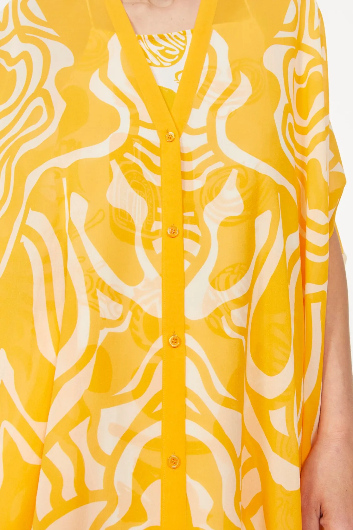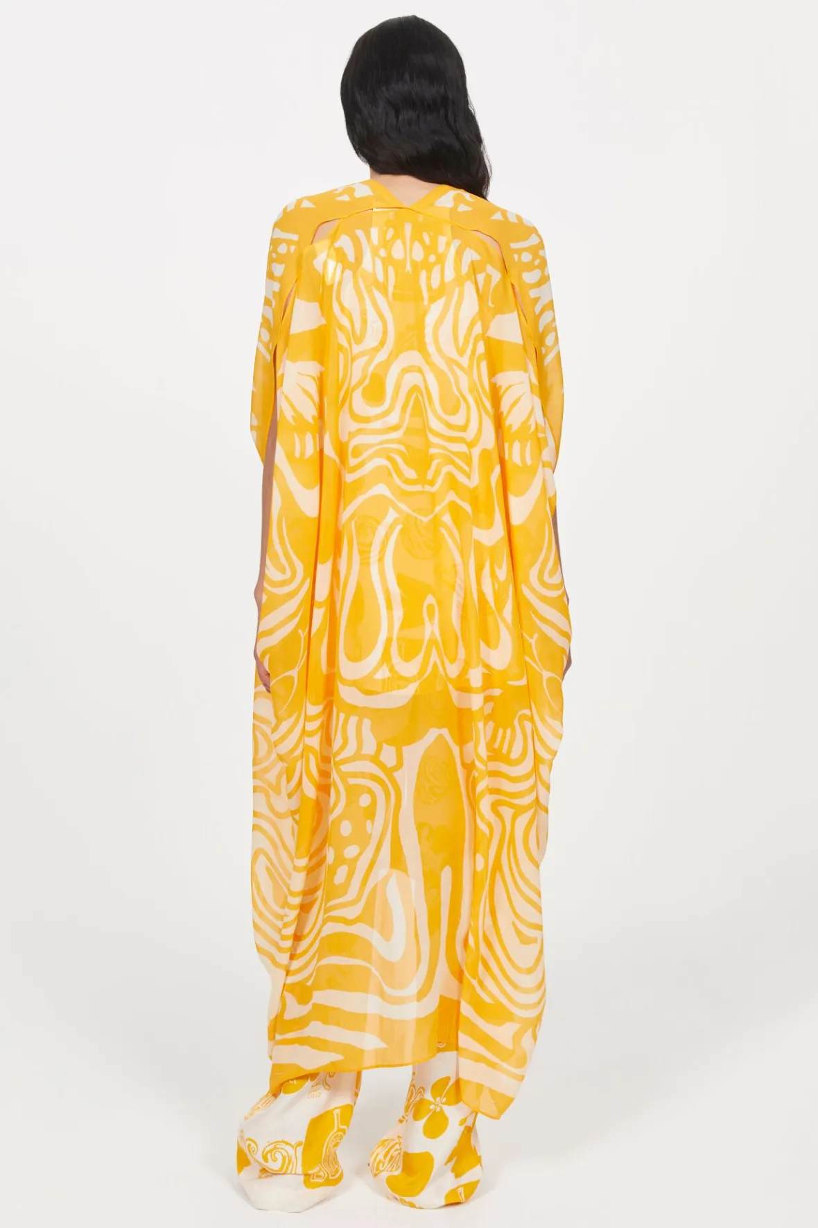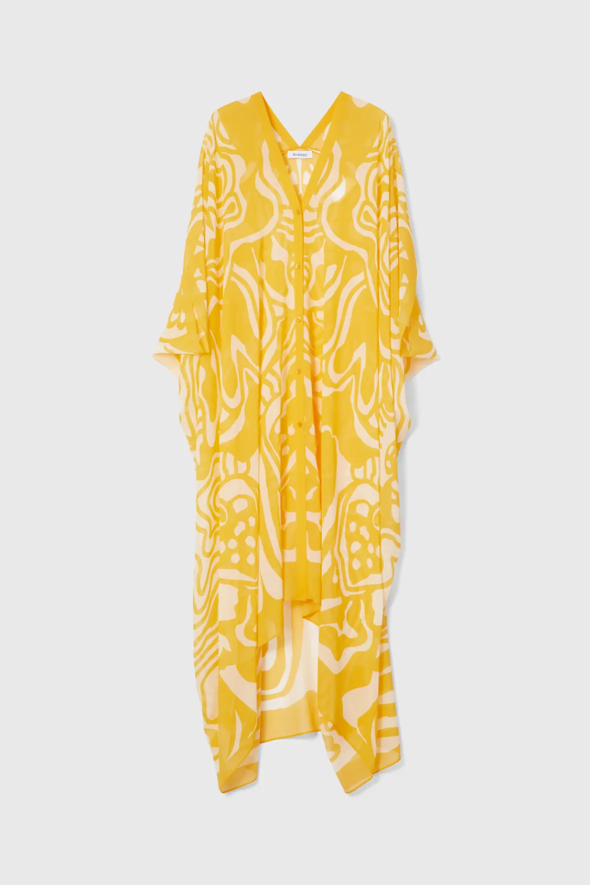 Rodebjer’s exclusive Cosmic Bloom print swirls across the flowing Agave caftan. Made from lightweight silk georgette, this oversized style fastens with a strip of buttons at the front, and drapes down the figure from its sharp V-neckline to its gathered, asymmetrical hemline.